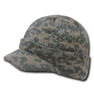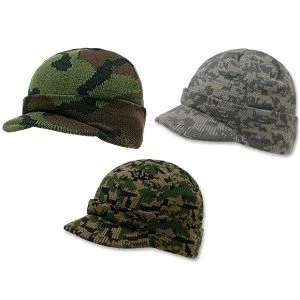 The Camo Brimmed Beanie offers a warmth and one-size versatility of a knit cap plus a shade visor to your eyes. Jeep cap with visor cuff.