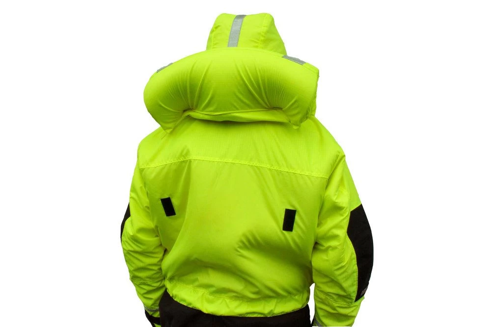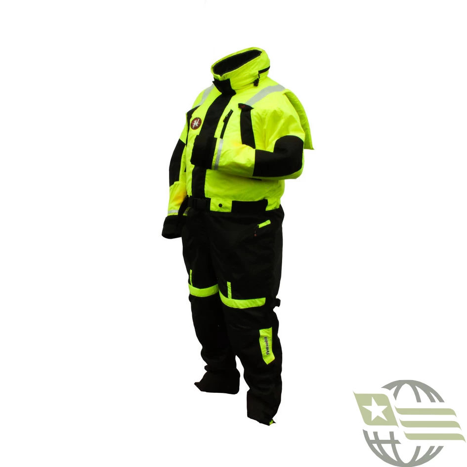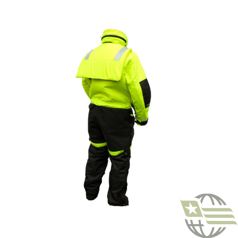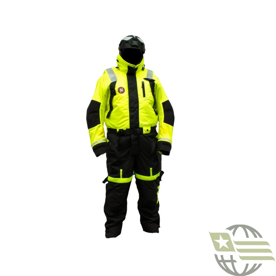An anti-exposure flotation and a thermal suit that works like a wetsuit. Cuffs and straps trap water inside the suit allowing the wearer’s body heat to insulate and keep warm.