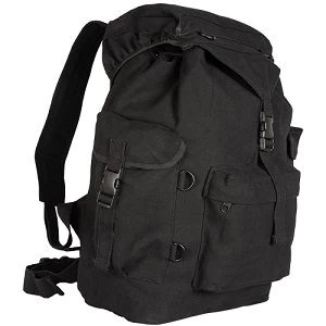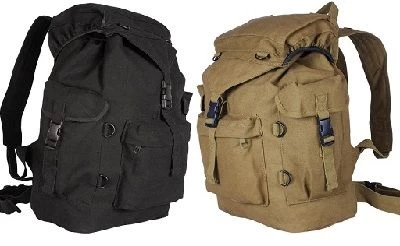 Great pack for everyday or the great outdoors. Replica of Australian Army rucksack. Large main compartment with storm flap, drawstring closure. Two side pockets, one large front pocket with zippered closure. Reinforced padded shoulder straps with quick release waist strap. The australian canvas rucksack is available in olive green, black or woodland camo.