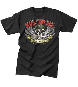 Here at Army Surplus World we carry the “Kill ‘Em All” T-shirt. The “Kill ‘Em All” T-shirt features an image of a skull and knife with the text “Kill ‘Em All Let God Sort ‘Em Out.” This t-shirt also features a cotton/poly fabric that is light to the touch with a tagless label. Order your Kill ‘Em All T-shirt from Army Surplus World today!