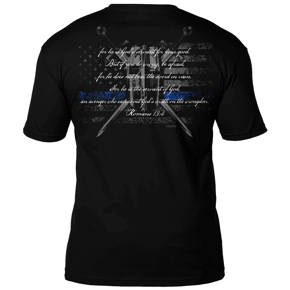 This t shirt combines the Blue Line American flag with the awesome Bible verse Romans 13:4 to further honor our men and women in blue.