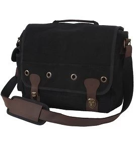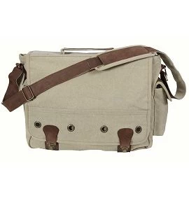 Here at army surplus world we have a leather and canvas trailblazer laptop bag. The trailblazer laptop bag is heavyweight washed cotton canvas with 4 brass grommets. The trailblazer laptop bag has a leather bottom and accents. The trailblazer laptop bag has a large main compartment with inside zippered pouch, padded sleeve with a strap for a laptop, front flap with 2 antique brass closures, 2 front pockets, and 1 side snap pocket which are great for storing pens, pencils and other supplies.