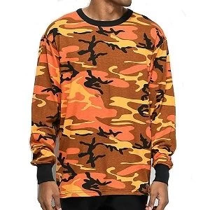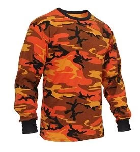 The Savage Orange Camo long sleeve t shirt features a look that is versatile and comfortable. The Savage Orange Camo t-shirt features a bright and bold orange camo print throughout with a black ribbed crew neck collar.