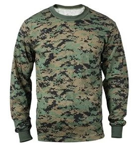 The woodland digital camo pattern is worn by the United States Marines. The woodland digital camo long sleeve shirt has a double needle sport collar to prevent neckline from sagging. The tshirt has a full cut body and color fastness for longer wear. Good quality with minimum shrinkage and a knitted cuff.