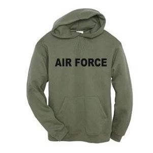 The air force sweatshirt is printed on a heavyweight blend hooded sweatshirt. SUPER SOFT. The air force sweatshirt is 50% cotton / 50%Poly. The air force sweatshirt is part of our line of patriotic t-shirts and sweatshirts. The air force sweatshirt has a double-lined hood with drawstring, muff pocket, and is double-needle stitching throughout. The Air Jet spun yarn creates a softer feel without pilling.