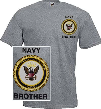 Here at army surplus world we carry Navy brother t-shirts. You can get Navy brother t-shirts in a hoodie, a sweatshirt, a zip-up hoodie, a regular unisex t-shirt and a long sleeve t-shirt. All of the Navy brother t-shirts are printed on preshrunk, heavyweight cotton materials. Order your Navy brother t-shirt from army surplus world today. The Navy brother t-shirt is printed on a grey garment. Order today.Here at army surplus world we carry Navy brother t-shirts. You can get Navy brother t-shirts in a hoodie, a sweatshirt, a zip-up hoodie, a regular unisex t-shirt and a long sleeve t-shirt. All of the Navy brother t-shirts are printed on preshrunk, heavyweight cotton materials. Order your Navy brother t-shirt from army surplus world today. The Navy brother t-shirt is printed on a grey garment. Order today.