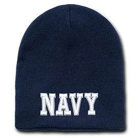 Navy Text Beanie available at Army Surplus World. High definition embroidery, knitted work beanie. Cuffless.