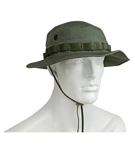 The Olive Drab Green boonie hat is made from a durable cotton ripstop material that protects you from the sun. The 2.5″ brim blocks sunlight from your eyes and the all cotton material keeps you cool on hot days. There are branch loops made of a tough nylon webbing along the crown for durability. Bellowed drain holes on the crown provide ventilation and a breathable interior. The leather keeper on the adjustable chin cord holds the hat in place when you are in motion or when you sweat. It also lets the hat be taken off and carried around the neck.