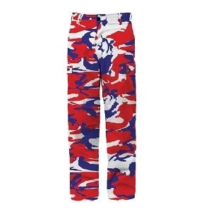 Stand out in Red, White & Blue Color Camo Tactical BDU Pants. The camo pants are constructed of comfortable and resilient cotton, polyester material. Modeled after the US Military’s standard issue BDU uniform the red, white and blue camo pants feature 6 versatile pockets, including 2 side cargo pockets and 2 back pockets. Built with double stitched seams and reinforced seat and knees, the camouflage pants are guaranteed to provide maximum durability. Equipped with adjustable waist tabs and drawstring ankle ties, the camo fatigues offer each user the perfect fit. Whether you are skateboarding, playing paintball/airsoft, or just looking for a military-style look, we are the optimal choice.