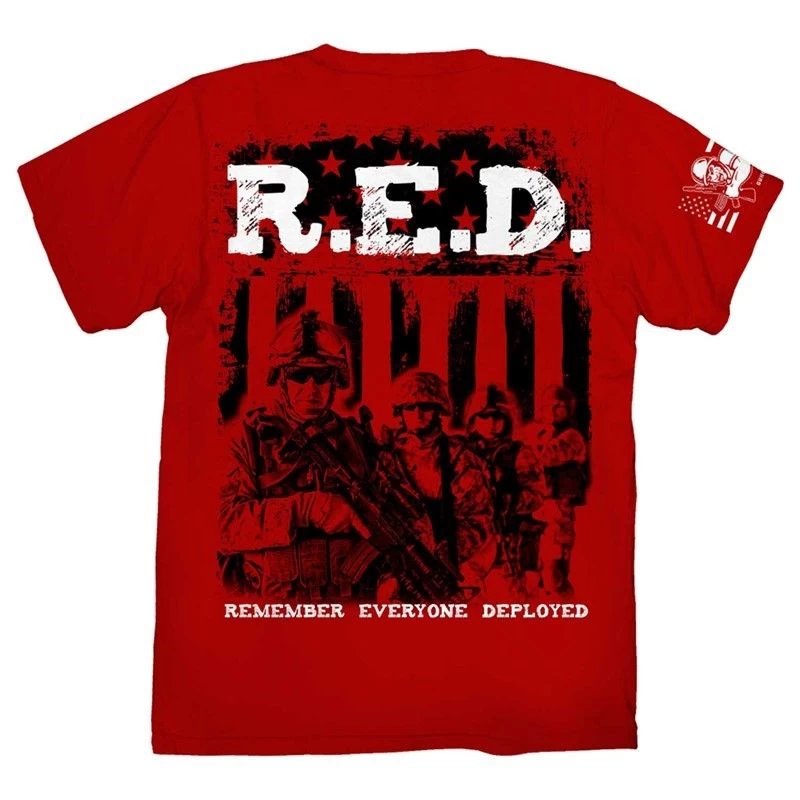 Here at Army surplus we Remember Everyone Deployed (RED). This shirt reminds everyone to think of all of the service members who are deployed and keep them in our thoughts and prayers until they come .