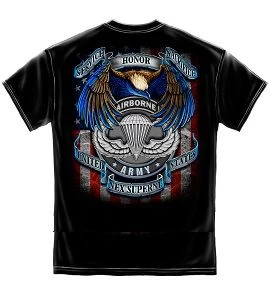 The Service, Honor, Sacrifice – Nex Superne or “Death From Above” US Army Airborne t-shirt has a large logo with jump wings on the back of the shirt and a pocket size logo on the front of the shirt. Printed on a well-made, comfortable cotton tee. The graphics on the Army Airborne shirts are crisp and clean with the promise of years of proud service. Recommended for those past and present serving in the Army Airborne and those that love and support them.