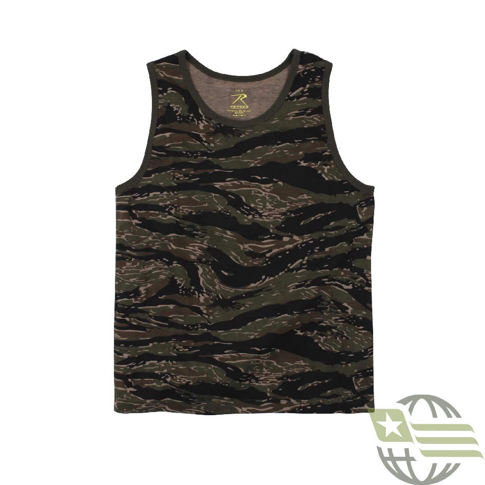 Stay cool, comfortable and in style in our tiger stripe camouflage tank tops. These military camo themed tank tops are in a poly / cotton fabric and are great for keeping cool on hot days.