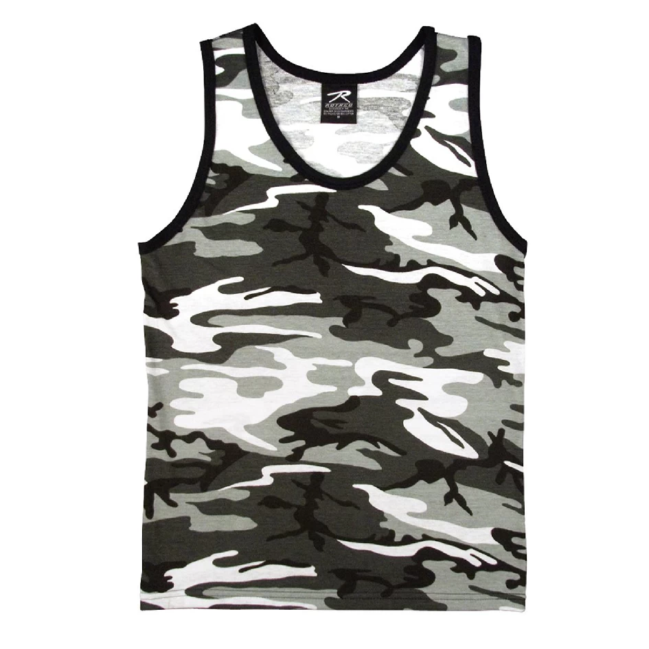This top selling City Camo Tank Top goes with everything from jeans to lounging shorts. Cotton/Polyester blend. Tagless label. Sleeveless t-shirt. Black piping around the neck and sleeves.