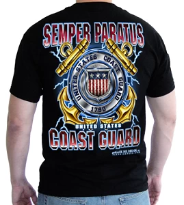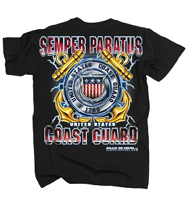 Coast Guard T-Shirt – US Coast Guard “Semper Paratus” meaning “Always Ready”. The graphics on the us coast guard t-shirts are crisp and clean with the promise of years of proud service. Large print with superior graphics on the back and a small left chest logo on the front. For those serving past and present in the United States Coast Guard and for those that love and support them.