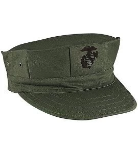 The marine corps utility cap has eight point stitching around the top. It comes with the black emblem on the front of the hat.