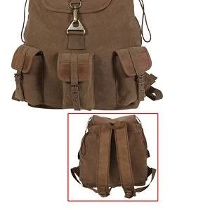 Vintage Canvas Wayfarer Backpack with Leather Accents features a heavy weight cotton canvas, leather bottom, large main compartment with top flap, drawstring top, 3 pockets w/leather flap & antique brass closure. Great bag to accommodate just about any need.
