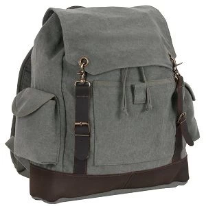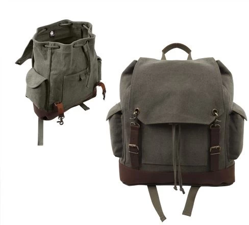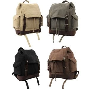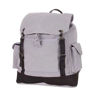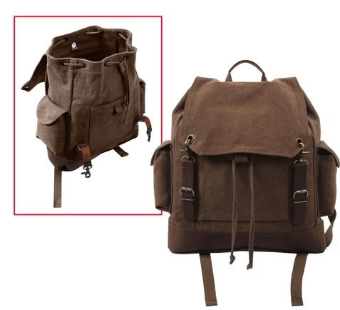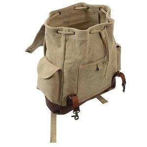 Vintage Expedition Rucksack is a heavy weight washed cotton canvas rucksack with a large main compartment, a front pocket, and two side pockets.The vintage rucksack features leather accents, buckle straps, a drawstring closure, and adjustable padded shoulder straps.