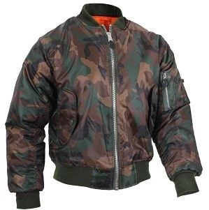 Army Surplus World’s Woodland Camo MA-1 Flight Jacket features a fully reversible rescue orange polyester lining, and a 100% nylon water repellent outer shell to give a classic bomber jacket look.